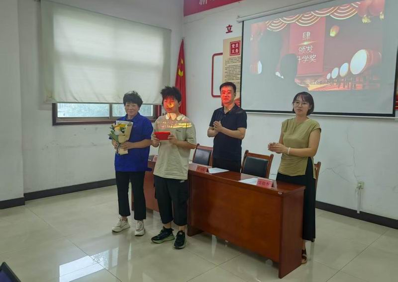 實(shí)業(yè)公司工會(huì)主席賈少緯、工會(huì)經(jīng)費(fèi)審查委員會(huì)主任劉興明為職工子女頒獎(jiǎng)。